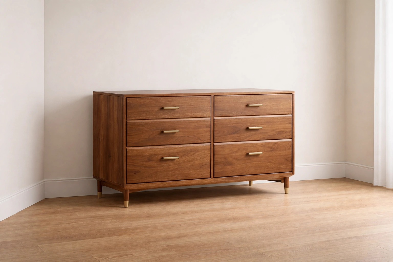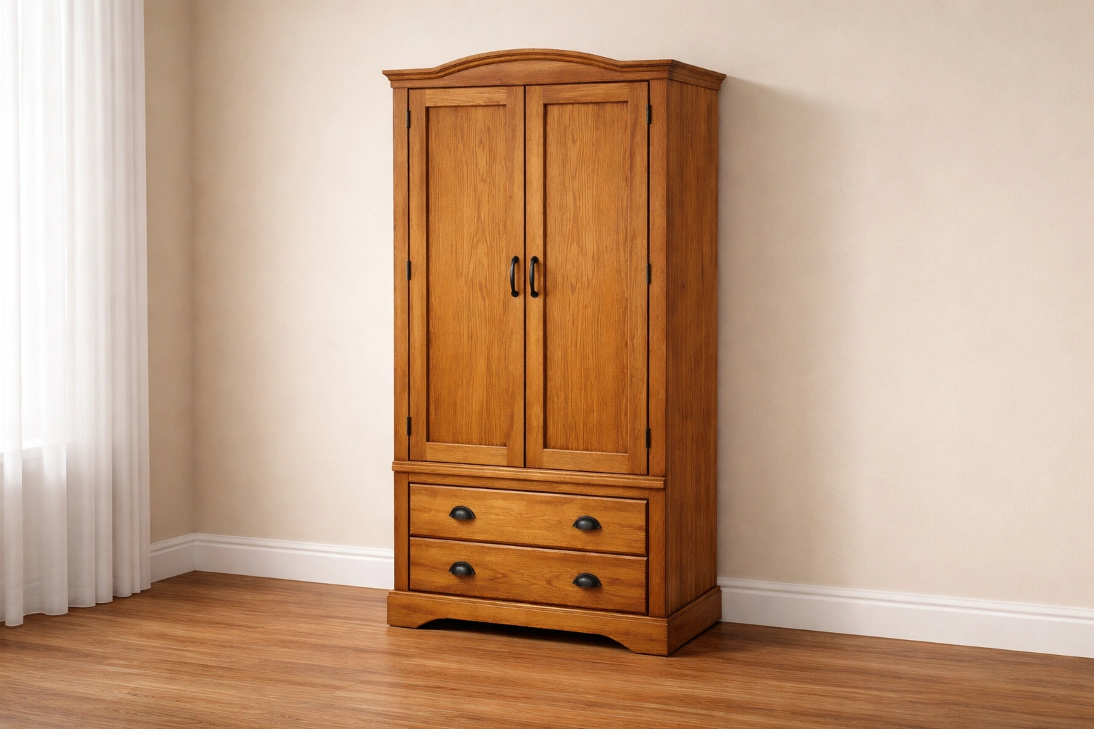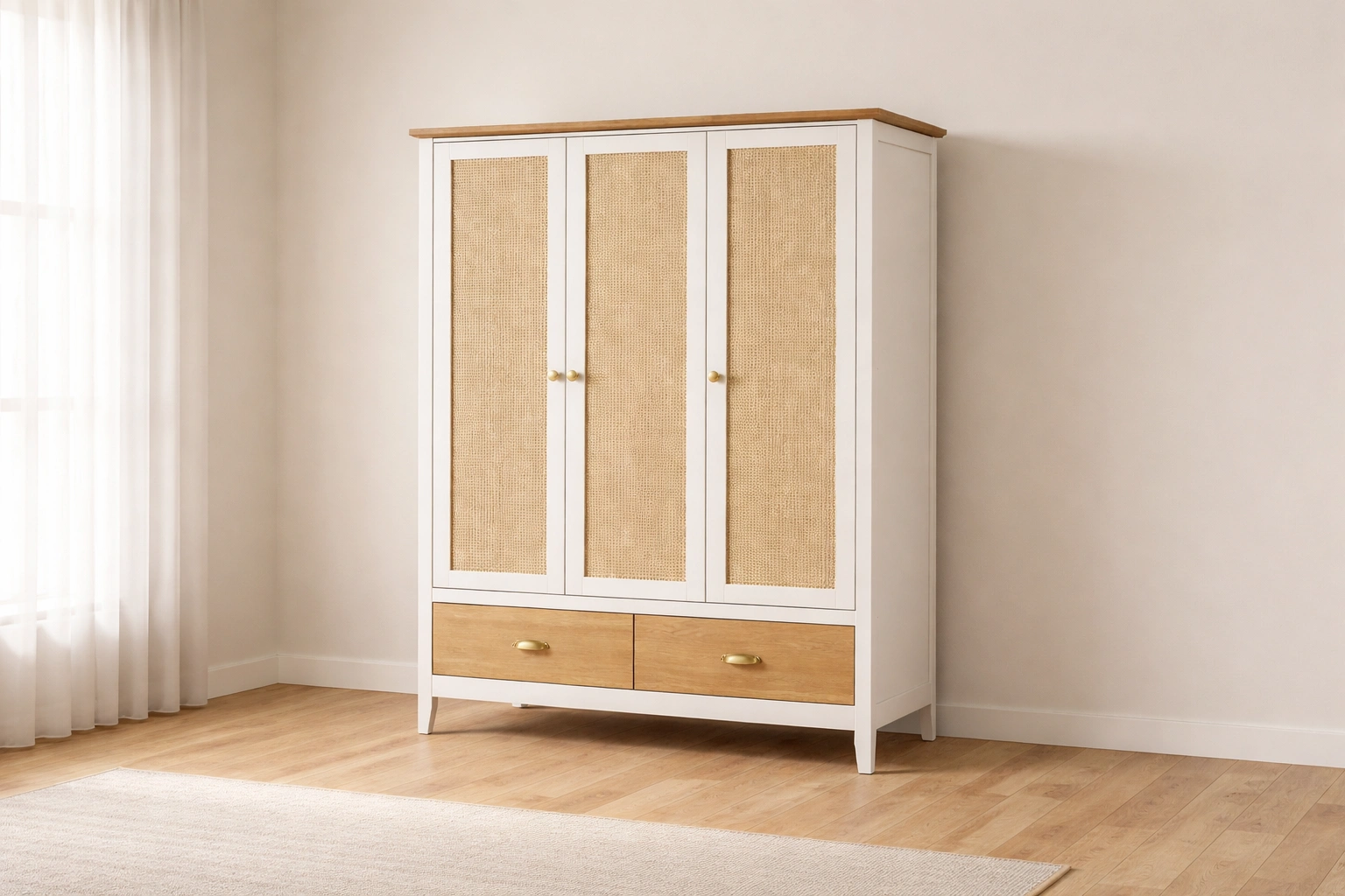 Armario de madera maciza y ratán con 3 puertas y 2 cajones