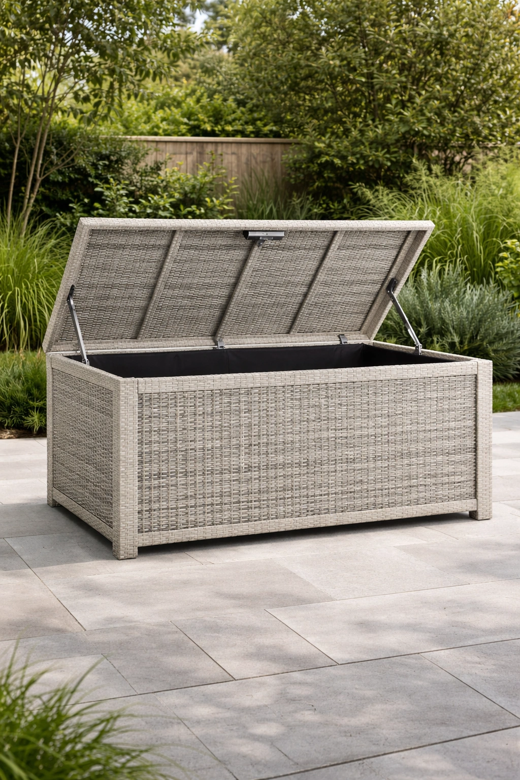 Baúl de almacenamiento de exterior de ratán sintético gris 120x60x50 cm